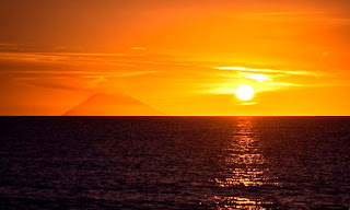 A fiery orange sun sets over the ocean, casting a shimmering reflection. A distant volcanic island is silhouetted on the horizon.