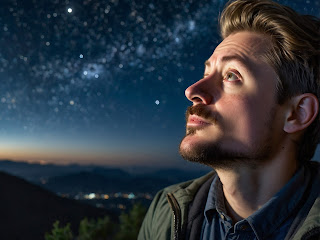Gazing up at the vast star-filled sky from the peak of a hill, a young man's face is illuminated by the twinkling constellations above.