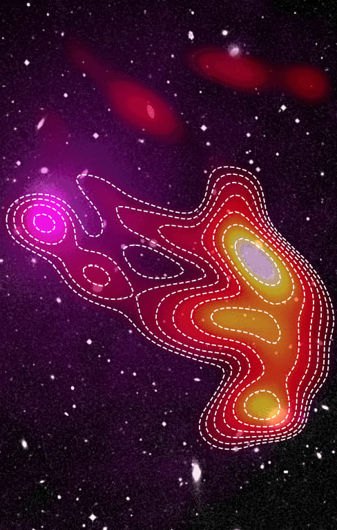 A cosmic structure born from a high-energy explosion (like a black hole explosion) disappears over millions of years as the structure expands and its electrons lose energy. Then, finally, it is re-energized by another cosmic cataclysm (like the collision of two galaxies), resulting in a massive structure that radiates brightly at certain radio frequencies but quickly dims at all others. It’s a ghost, a jellyfish and a phoenix, all in one event!