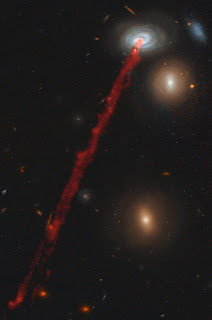 The narrow funnel-shaped feature emanating from the galaxy’s center is the red glow of hydrogen gas. This glowing tail extends for nearly 200,000 light-years, but the pencil-like structure is comparatively narrow โ€“ only 7,000 light-years wide. The tail’s clean edges and smooth structure suggests that magnetic fields play a prominent role in shaping it.