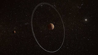 Quaoar is a small 555 km diameter body orbiting the boundaries of the Solar System, within the Kuiper Belt, 44 AU from the Sun. Quaoar is also orbited by a small moon with a radius of 80 km.