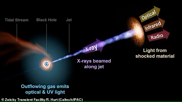 After the star was obliterated, a stream of stuff that extended along the black hole’s axis of spin shot out of it at a speed that was almost as fast as light. This produced X-ray radiation, which was absorbed by the black hole’s surrounding dust and then released again as infrared radiation, radio waves, and visible light.