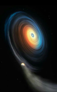 This illustration shows the white dwarf WDJ0914+1914 and its Neptune-like exoplanet. Since the icy giant orbits the hot white dwarf at close range, the extreme ultraviolet radiation from the star strips away the planet’s atmosphere. While most of this stripped gas escapes, some of it swirls into a disc, itself accreting onto the white dwarf.