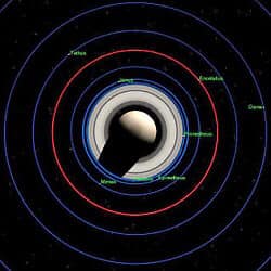 Enceladus’ orbit around Saturn, showing its position in the region of Saturn’s inner moons.  (Only the largest moons are shown).