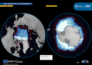 The Copernicus Marine Service composite from September 2025 captures each pole at its seasonal extreme: the Arctic is at late-summer minimum, while the Antarctic is at late-winter maximum. Analysts at Mercator Ocean International report: