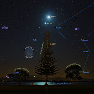 In fact, an imposing Norfolk pine, originally from the namesake Australian island, stands out in the foreground. This tree can be useful for identifying the main astronomical objects present in the image. Just above its tip, in fact, a beautiful conjunction between the Moon and Venus is visible, while between its branches on the right we can see Jupiter.