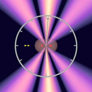 Figure 1: Schematic representation of the zeptosecond measurement. The yellow photon (from left) interacts with the hydrogen molecule’s electron cloud (gray), ejecting electrons whose waves (purple-white) interfere. The tilt in this pattern reveals the photon’s travel time across the molecule. Credits: Sven Grundmann, Goethe University Frankfurt .