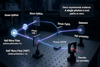 This reduction can only be explained if each individual photon was somehow experiencing both polarisation rotations simultaneously – meaning it was physically present in both paths at the same time. We’re not talking about a 50-50 probability here; we’re talking about actual physical delocalization where half the photon exists in one path and half in the other.
