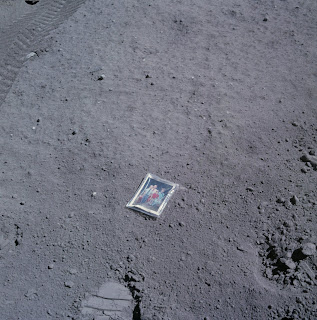 Carrying a cherished memento within a plastic bag, Charles brought along a family photo featuring himself, his wife, and their children. Before leaving the lunar surface for good, he left this photograph behind and captured the heartwarming image seen here.