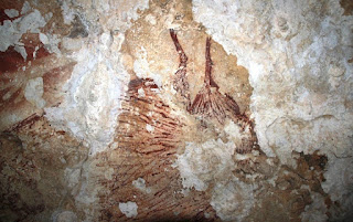 In caves on the Indonesian island of Sulawesi, ancient peoples marked the walls with red and mulberry hand stencils, and painted images of large native mammals or imaginary human-animal creatures.
