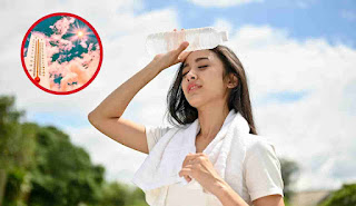 Woman cooling off with a water bottle under the sun, with a thermometer showing high temperature in the corner.