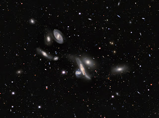 Image: Composite image of Copeland’s Septet taken with the 4-metre Blanco Telescope at Cerro Tololo Inter-American Observatory, Chile. The image was created using broadband filters that are centred at 474 nm (G-band, blue), 644 nm (R-band, green), and 926 nm (Z-band, red). NGC 3753 is the biggest galaxy in the image towards the centre of the image. On the left of NGC 3753 is NGC 3754, while on its right is NGC 3750. Further on the right is NGC 3751. On the upper left of the image PGC 36010 is the galaxy closer to NGC 3753. Moving clockwise from the latter is NGC 3748, followed by NGC 3745, and then NGC 3746.