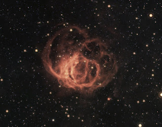 Image: Composite infrared image of WR 102 taken with the Spitzer Space Telescope and the Wide-field Infrared Survey Explorer (WISE). It was created using broadband filters that are centred at 8 μm (blue, from Spitzer), 12 μm (green, from Spitzer) and 24 μm (orange, WISE). Note that the star is invisible in this image. Image Credit: Judy Schmidt