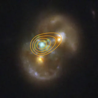 Radio emissions (the yellow contour lines) agree with JWST on the presence of a third supermassive black hole in this galaxy merger.   Image Credit: NASA, ESA, CSA, STScI, VLA, P. van Dokkum (Yale University).