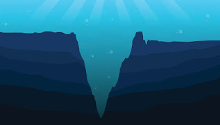 Stylized deep-sea trench with dark layered cliffs, faint bubbles, and surface rays in blue water.