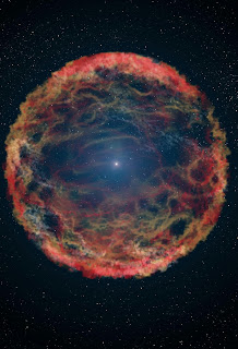 At that time, without the energy to keep everything together, gravity wins the tug of war and the star collapses. Its outermost layers sag towards the core with a Homeric force, slamming back and forth – being expelled into open space in a huge cloud, hot and lethal to anything around it. As in the drawing down here.