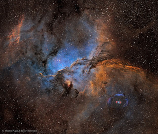 One of NGC 6188’s most intriguing aspects is the presence of a reflection nebula within its bounds. This phenomenon is largely due to the nearby open cluster NGC 6193, visible to the naked eye, which has birthed a region of reflection nebulosity within the emission nebula.