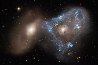 Lastly, a composite optical image of Arp 143 captured by the Hubble Space Telescope provides an awe-inspiring view. The image was created using broadband filters centered at 475 nm (g-band, blue), 606 (V-band, green), and 814 nm (I-band, orange), along with a narrow band filter that is focused on the emission of ionized hydrogen (Hα, red). NGC 2445 can be seen on the right,