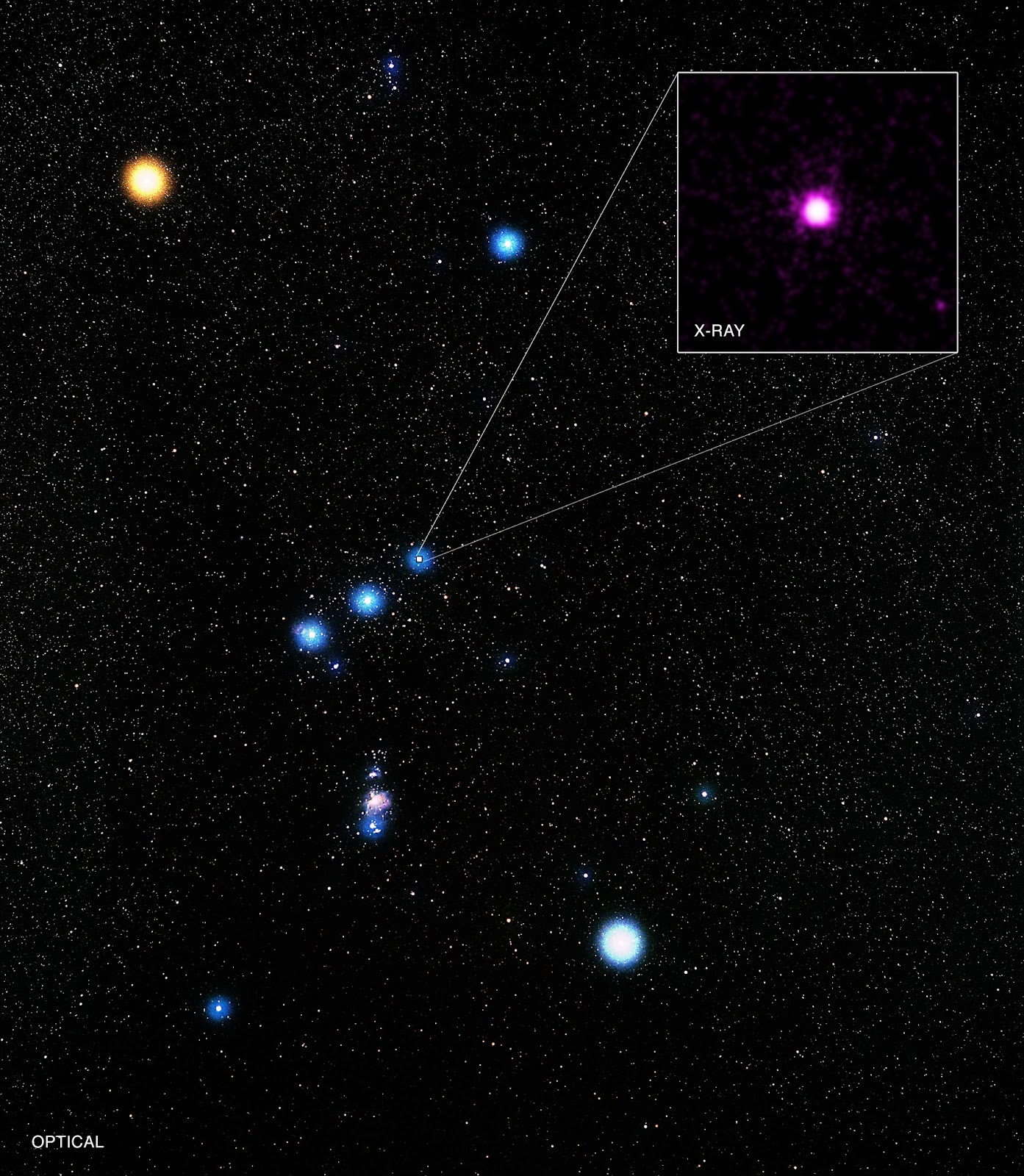 In particular, Mintaka, shown in the x-ray box, is a star that deserves attention: it is in fact a multiple system, consisting of five components.