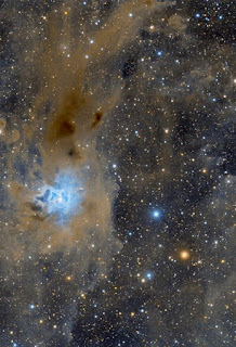 This image brings us different objects present in the direction of the constellation Cepheus, the Cepheus. One is the Iris nebula, which appears near the center of the image and has several dust clouds surrounding a hot young star. The bluish glow comes from the starlight reflected by the dust grains, while the central filaments appear to have a reddish glow thanks to a curious interaction: some of the grains manage to convert the ultraviolet light emitted by the star into visible red light. On the right side of the image, we find some ghostly clouds near a complex of molecular clouds.