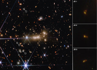 Gravitational lensing by the galaxy cluster MACS0647, in which the massive foreground cluster distorts and lenses the light emitted by distant background galaxies along the line of sight is on vivid display here in this recent multi-colour infrared image from the James Webb Space Telescope (JWST). In particular, the background source MACS0647-JD is seen to be lensed three times by the cluster.