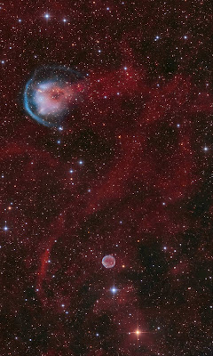 Planetary nebulae represent the last short phase in the life of a medium star like our sun. The dying star (which collapses from a red giant to a white dwarf) consumes the last part of the fuel in its core and drives a large part of its outer shell into space. This material is then heated and radiated by the radiation of the rest of the stars, resulting in glowing gas clouds that can have complex structures, since the emission of the mass from the star is uneven depending on time and direction.