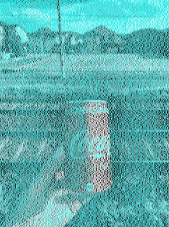 In the can image, the colors black, white, and blue are arranged in such a way as to create the illusion of red. This happens because our brain uses the surrounding colors to interpret the missing ones, based on past experiences and visual contexts.