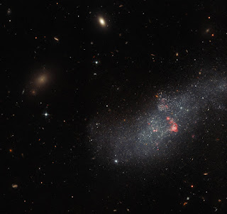 Suspended amid a myriad of distant galaxies, UGCA 307 is situated approximately 26 million light years away from our planet, located in the constellation of Corvus. This galaxy consists of a diffuse band of stars, with some areas of red color that indicate relatively recent star formation regions.