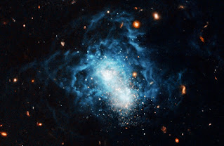 Image 1: Composite optical image of I Zwicky 18 taken with the Hubble Space Telescope. It was taken using broadband filters centred at 660 nm (V-band, light blue) and 814 nm (I-band, orange).