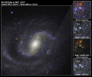 In NGC 1637, ~12.0 Mpc away, a Type II supernova dubbed SN 2025pht was discovered on June 29, 2025 (ASAS-SN). Researchers then aligned post-explosion Hubble images with pre-explosion JWST and Hubble imaging to identify a credible progenitor candidate detected from 0.8 to 8 µm (HST/WFPC2 F814W through JWST/MIRI F770W). It’s the first JWST detection of a supernova progenitor star, and the longest-wavelength pre-explosion detection of any progenitor to date . Keck/LRIS spectroscopy on July 27, 2025 confirmed a Type II-P–like spectrum during the plateau phase, with Hα velocity ~6,800 km s⁻¹ and negligible Na I D host extinction along the line of sight .