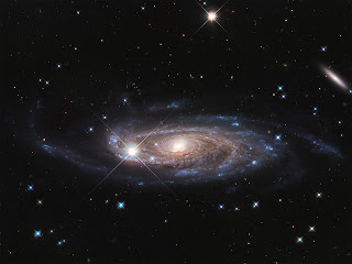 UGC 2885 spiral galaxy captured by Hubble, showing blue spiral arms and bright core against a dark starry background.