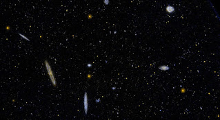 In our local region of the universe the Virgo Cluster, shown here is a sort of center, its mass distorting everything around it, but the unvierse as a whole has no center. Image Credit: NASA/JPL-Caltech/SSC