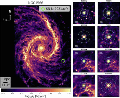 SN 2021aefx in NGC 1566 at ≈2–21 μm. Left panel: MIRI F1130W PHANGS-JWST image of NGC 1566 showing the location of SN 2021aefx, marked with a green circle. Right panels: zoom-ins on SN 2021aefx in each PHANGS-JWST filter. The top four panels show 200 pc × 200 pc cutouts from NIRCam images at 2.0–3.6 μm. The bottom four panels show 1 kpc × 1 kpc MIRI images at 7.7–21 μm. The inner green circle marks the aperture used in the photometry measurement, and the two concentric dashed cyan circles mark the inner and outer apertures used for the background subtraction. Credit: The Astrophysical Journal Letters (2023). DOI: 10.3847/2041-8213/acb6d8