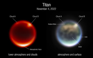 The image on the right is a colour-composite image captured using a combination of NIRCam filters. Some of the prominent surface features labelled on the image are Kraken Mare, Belet and Adiri. Kraken Mare is thought to be a methane sea, Adiri is a bright albedo feature (fraction of light reflected by a body), and Belet is composed of dark-coloured sand dunes.