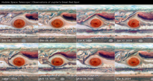 Eight snapshots of the Great Red Spot taken by the Hubble Space Telescope between Dec. 10, 2023 and March 8, 2024. Look carefully and you can see its width changing. (Image credit: NASA/ESA/Amy Simon (NASA-GSFC))