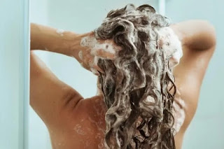 Person washing long hair with shampoo in the shower, creating lather and massaging scalp.