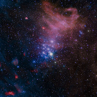 Image: Composite image of NGC 3293. It was created using X-ray data from the Chandra X-ray Observatory (purple), optical data from the MPG/ESO 2.2-metre telescope at La Silla, Chile (red, green, and blue), infrared data from Spitzer Space Telescope (blue and white), and far infrared data from Herschel Space Observatory (red). Due to its appearance, it is nicknamed the Gem Cluster.