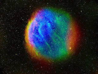 Sh2-216 is a very faint object but I managed to get a decent amount of data to ensure that the filaments and background is sufficiently highlighted. The nebula is rich in O3 and S2 signal which mapped to blue and red appear as a diffuse multicoloured background overlaid by a green and yellow Ha streaks. The combination ended up looking like a surreal/psychedelic rainbow coloured candy.