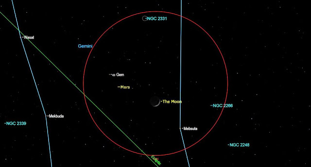 Three planets adorn the evening sky and two in the predawn morning sky. In the evening, Mars continues to draw away from Earth and grows progressively dimmer. It now ranks with stars of the second magnitude and spends much of this month in Gemini in the general vicinity of the stars Pollux and Castor.