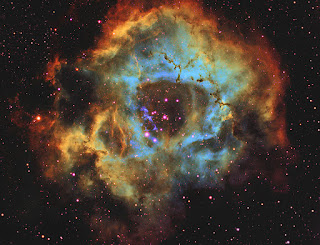 โข This is a Wide Field View of the “Rosette Nebula” captured using a SHO Hubble Palette. In this Image, Red Color is assigned to Sulphur, Green to Hydrogen alpha and Blue to Oxygen. This Image reveals Spectacular Details and the awe-inspiring Beauty of the “Rosette Nebula”…