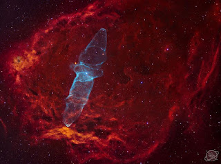 In 2011, French astrophotographer Nicolas Outters discovered a dim and challenging to observe emission nebula located 2300 light-years away from Earth in the constellation Cepheus, which was named Ou4. This nebula is also known as the Cosmic Squid Nebula due to its bilobed shape and bluish color, which is caused by the emission of doubly ionized oxygen atoms. It is on the same line of sight as the Flying Bat Nebula, which appears red because of hydrogen atoms emission. Recent studies have suggested that the Squid Nebula is actually within the Flying Bat Nebula.