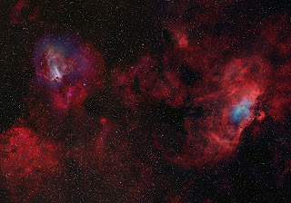 They lie along the spiral arm suffused with reddish emission charactistic of atomic hydrogen gas, and dusty dark nebulae. M17, also called the Omega Nebula, is about 5500 light-years away, while M16 is some 6500 light-years distant. The center of both nebulae are locations of well-known close-up images of star formation from the Hubble Space Telescope.