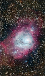 The Nebula is classified as an emission nebula, a type of nebula that is made of ionized gases. In the case of the Lagoon Nebula, the gas is mostly Hydrogen. A familiar example of ionized gas is neon signs, where energy is passed through tubes filled with neon so that they light up. Emission nebulae work in the same way; as energy from new stars or dying stars passes through the gas, the cloud lights up. If the energy that’s ionizing the gas is low, like in the Lagoon Nebula, it will appear red.