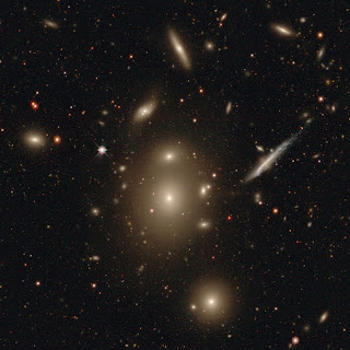 However, this does not mean that elliptical galaxies are completely absent from the cluster. In fact, astronomers have identified three distinct populations of galaxies. The first is made up of elliptical galaxies, which are the most massive despite being the fewest in number, the largest of which can be seen in the center of this image. The second population is made up of small lenticular galaxies, which are somewhere between elliptical and spiral. The third population, the largest, is obviously the spiral galaxies, which are very young and some of them are still forming, as evidenced by the numerous star formation events that have been observed.