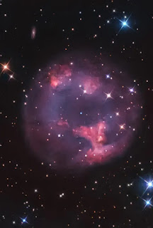 This is the planetary nebula Abell 7, located almost 1,800 light-years from us towards the constellation Lepus, the Hare. With a spherical shape and diffuse brightness, Abell 7 is approximately 8 light-years in diameter and has some interesting details inside, which stand out when observed by instruments equipped with narrowband filters.