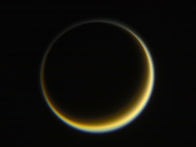 NASA’s Cassini spacecraft looks toward the night side of Saturn’s moon Titan in a view that highlights the extended, hazy nature of the moon’s atmosphere. The view was acquired at a distance of approximately 1.2 million miles (2 million kilometres) from Titan.