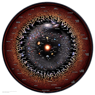 The inner and outer planets, the Kuiper belt, the Oort cloud, the Alpha Centauri star, the Perseus Arm, the Milky Way galaxy, the Andromeda galaxy, and other nearby galaxies, the cosmic web, cosmic microwave radiation, and at the very edges, invisible plasma from the Big Bang. See below for versions that aren’t cut off and that you can zoom in on.