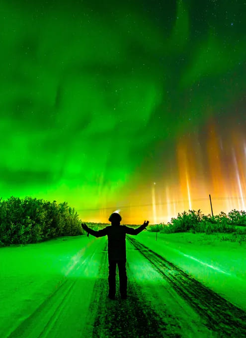 On the one hand, we have an aurora; on the other, colored pillars of light. It’s even difficult to decide which one is the most beautiful, isn’t it? In the case of the left part of the image, we see auroras, a phenomenon that begins with the particles expelled by the Sun. Upon arriving here, some of them encounter the magnetic field of our planet and reach the atmosphere, interacting with the different gases from it and forming the brightly colored auroras we know.