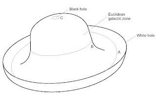In the grand scheme, the universe’s global topology is shaped by the spatial field, as represented by a Breton hat in our illustration. The curvature of this field subtly transitions from black holes to expansion near white holes. Simultaneously, the micro-dimensions form quantized, step-wise progressions between the poles, which align with the constant field curvature of space.