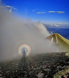 The Brocken Spectre is essentially a type of optical phenomenon known as a glory. A glory is more commonly seen from an airplane window when passengers spot the shadow of the airplane on the clouds below. However, the shadow of the airplane has nothing to do with the glory; they just happen to be located in the same spot, opposite the Sun.